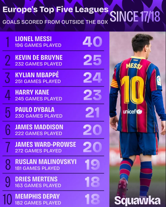 Messi's tally of 40 long-range goals stands 15 clear of the nearest competitor, cementing his legacy as the premier long-distance threat in the decade.