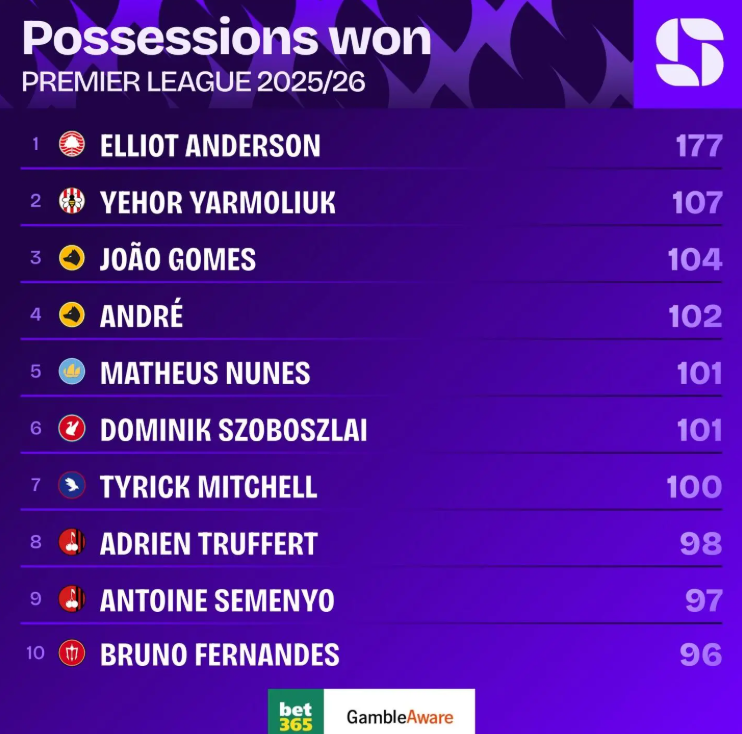 According to the latest data from Squawka, Anderson’s statistical dominance in defensive transitions is unprecedented. He has successfully regained possession 177 times in the Premier League this season, a figure that places him at the top of the league rankings. Remarkably, his tally is 70 recoveries higher than his closest rival, Brentford’s Yehor Yarmoliuk, who sits in second place with 107 recoveries. This massive gap highlights Anderson’s unique ability to read the game and disrupt opposition play more frequently than any other player in England.