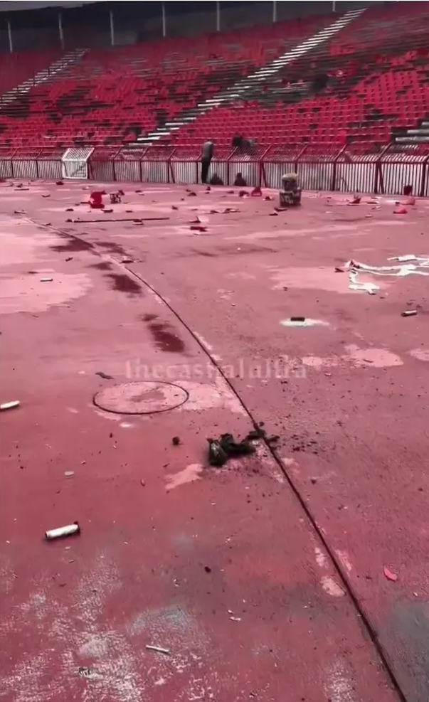 Newly released images reveal the severity of the aftermath: large amounts of debris scattered along the edge of the pitch, rows of seats burned and charred black. Some seats were so badly damaged that they had to be removed and thrown onto the field.